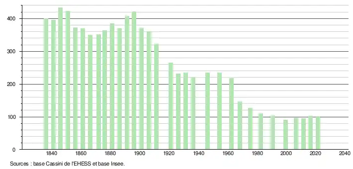 L'évolution du nombre d'habitants est connue à travers les recensements de la population effectués dans la commune depuis 1836. Pour les communes de moins de 10 000 habitants, une enquête de recensement portant sur toute la population est réalisée tous les cinq ans, les populations légales des années intermédiaires étant quant à elles estimées par interpolation ou extrapolation[23]. Pour la commune, le premier recensement exhaustif entrant dans le cadre du nouveau dispositif a été réalisé en 2006[24].