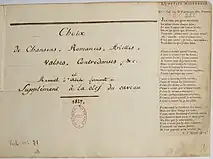 - Choix de Chansons, Romances, Ariettes, Valses, Contredanses, &tc et Recueil d'airs formant Supplément à la clef du caveau, 1827 (recueil d'airs n°882 à 1010)