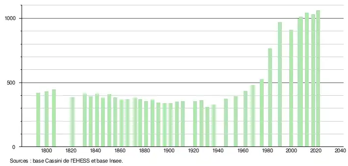 L'évolution du nombre d'habitants est connue à travers les recensements de la population effectués dans la commune depuis 1793. Pour les communes de moins de 10 000 habitants, une enquête de recensement portant sur toute la population est réalisée tous les cinq ans, les populations légales des années intermédiaires étant quant à elles estimées par interpolation ou extrapolation[20]. Pour la commune, le premier recensement exhaustif entrant dans le cadre du nouveau dispositif a été réalisé en 2007[21].