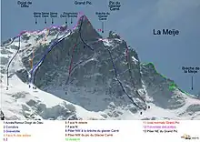 - la Meije Orientale (voie normale PD), qui peut être prolongée par la traversée Meije Orientale-Pavé-Gaspard (D) ;