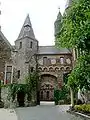 Dans la cour se trouve un puits, profond de 50 mètres. On peut également observer le beffroi, orné de quatre tourelles, et la tour des sorcières, seul vestige intact de l'ancien château.