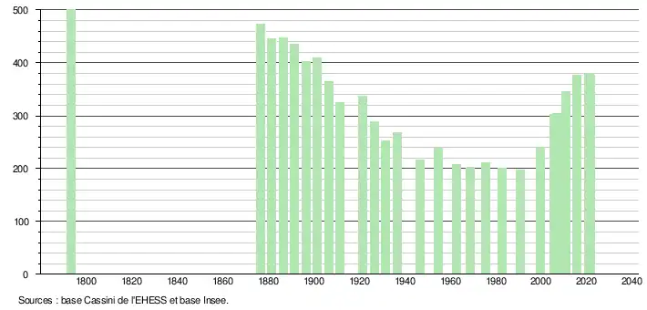 L'évolution du nombre d'habitants est connue à travers les recensements de la population effectués dans la commune depuis 1793. Pour les communes de moins de 10 000 habitants, une enquête de recensement portant sur toute la population est réalisée tous les cinq ans, les populations légales des années intermédiaires étant quant à elles estimées par interpolation ou extrapolation[25]. Pour la commune, le premier recensement exhaustif entrant dans le cadre du nouveau dispositif a été réalisé en 2005[26].