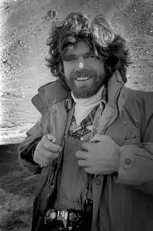 Reinhold Messner, né le à Bressanone/Brixen dans le Tyrol du Sud, est un alpiniste italien de langue allemande, considéré par beaucoup comme l'un des meilleurs du XXe siècle[1]. Grand défenseur du style alpin et pourfendeur du style expédition, il est notamment connu pour avoir réalisé la première ascension de l'Everest sans apport d'oxygène avec Peter Habeler, en , puis en solitaire à nouveau sans oxygène en . Il est en outre le premier à avoir gravi les quatorze sommets de plus de 8 000 mètres, en , et le deuxième à avoir atteint les points culminants des sept continents, en décembre de la même année.