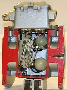 - Sur une accumulation lente de gaz, due probablement à une surcharge, le gaz s'accumule dans la partie supérieure du relais tandis que le niveau d'huile diminue. Une détection par flotteur est utilisée dans ce cas pour générer un signal d'alarme. Ce système détecte aussi les fuites d'huile.
