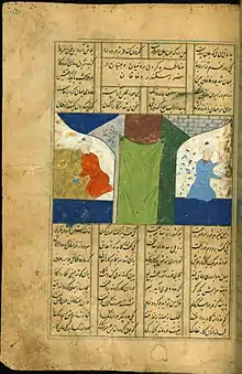 Peinture intitulée Séparé par un rideau vert, un artiste chinois et romain en concurrence l'un avec l'autre. d’après une copie d'époque timouride datant de 1481 d'un original peint par Nizami Ganjavi (1141–1209).