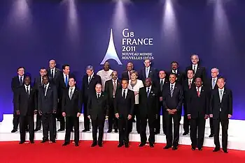 Au G20, l'UE a le statut de membre au côté de l'Allemagne, de la France, de l'Italie et du Royaume-Uni pour les pays européens[63]. Elle y représente les 23 autres pays qui sont parfois invités indépendamment dans le cadre des négociations internationales portant essentiellement sur l’économie et la finance.