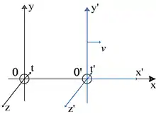 On considère deux référentiels et , le premier référentiel étant animé de la vitesse par rapport au référentiel . Pour simplifier le calcul on travaille d'abord dans le cadre de transformations dites « spéciales », caractérisées par le fait que les systèmes d'axes x, y, z et x′, y′, z′ sont parallèles, que les axes O′x′ et Ox sont communs et parallèles à la vitesse , et en supposant que quand les origines spatiales des deux référentiels étaient confondues, les horloges (fixes dans les référentiels respectifs, en O et O′) indiquaient toutes deux t = 0 et t′ = 0 (initialisation des horloges). Cette restriction ne nuit nullement à la généralité des résultats. On écrira ci-dessous les formules relatives à une vitesse pointant dans une direction quelconque.