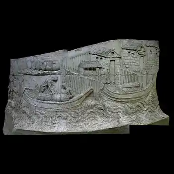 | III | Le rivage est devenu abrupt mais quelques arbres parviennent à pousser entre les rochers. En arrière, la ville continue de s'étendre, riche en monuments. L'un d'entre eux est bien visible au centre, le rez-de-chaussée pourvu d'arcades. Les épaisses murailles de la ville, construites en pierre de taille et couronnées de créneaux, sont percées de plusieurs portes cintrées. Au milieu, assis dans une grotte sur le bord du Danube, la divinité associée au fleuve, le dieu Danuvius ou Ister, la tête ceinte de plantes aquatiques, observe l'armée romaine qui sort de la ville[32]. |