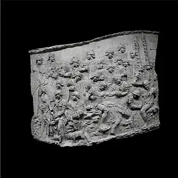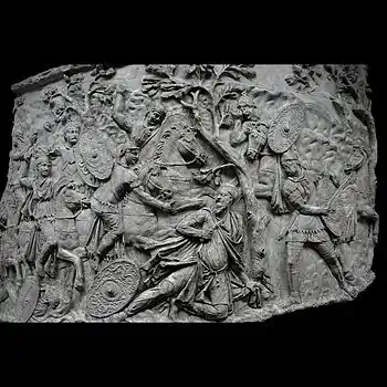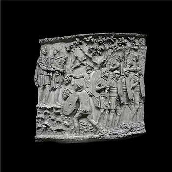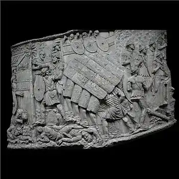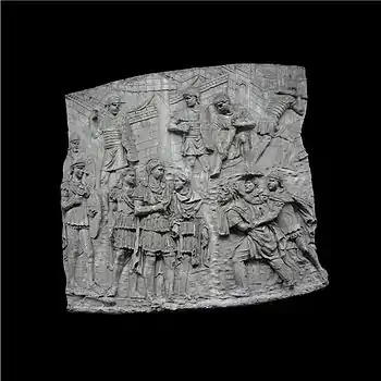 | XLII | Bataille d'Adamclisi[a 6] La cavalerie romaine engage le combat contre les Daces qui ont pris position sur une colline, tandis que les légions attaquent de front, soutenues par des auxiliaires germains. L'armée dace, défaite, tente de fuir à travers les bois. Le chemin est couvert de morts et de blessés. |