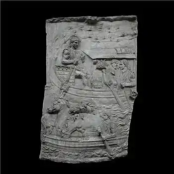 | XXXIV | Voyage sur le Danube Au premier plan, quatre chevaux ont été embarqués dans une petite barque gouvernée par un seul rameur. Au second plan, un navire de transport chargé d'armes et de bagages est gouverné par le timonier assis à la poupe. Deux rameurs (remiges) se tiennent sous une toile tendue, destinée à protéger la cargaison des intempéries, sur laquelle ont été posés plusieurs boucliers. |