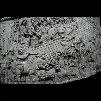 À l'intérieur du camp se dresse le praetorium, la tente impériale, devant laquelle se tient Trajan, entouré de ses lieutenants et haruspices. L'empereur porte l'habit sacerdotal du pontifex maximus et offre le sacrifice. Au milieu avancent les trois victimes : un bœuf, retenu par un victimarius armé d'une hache, un mouton et un porc. Des joueurs de trompettes (tubicines) et des sonneurs de cor accompagnent le sacrifice. Dépassant des remparts, on remarque les enseignes : trois étendards de cohorte et deux étendards de manipule entre lesquels on aperçoit l'aigle de la légion et une bannière de cavalerie fixés sur une lance. Omen Cette scène représente un évènement curieux qui semble de bon augure[36] : un artisan tombe au bas de sa monture. Trajan et deux de ses lieutenants (probablement Lucius Licinius Sura et Tiberius Claudius Livianus[37]) se tiennent sur un promontoire rocheux. Percevant dans cette chute un signe offert par les dieux (augurium oblativum), deux solutions s'offrent à Trajan : accepter (accipere) ou refuser (refutare) le présage (omen). L'empereur interprète ce fait comme un présage qu'il accepte (accipere omen) d'un geste de la main.[38],[39]. |
