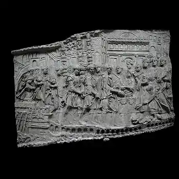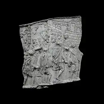 | VI | Consilium castrense Trajan est entouré de deux de ses lieutenants (l'un assis comme l'empereur sur un siège pliant) sur une tribune. Quatre licteurs se tiennent derrière le lieutenant de gauche, l'un d'entre eux portant sur l'épaule la hache et les fasces. À droite, quatre parlementaires appelés devant le conseil de guerre sont chargés de traiter avec le roi dace, Décébale, des conditions de paix, démarche qui se soldera par un échec. Complètement à droite, des écuyers conduisent les chevaux des officiers sous un bouquet de chênes. L'un de ces écuyers portent un fanion d'étoffe frangée en haut d'une lance. |