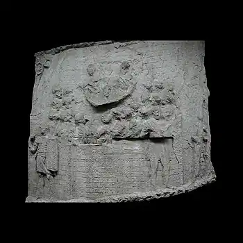 Donativa Trajan, entouré de son état-major, assis sur un siège pliant (stella castrensis), distribue des décorations aux soldats auxiliaires qui se sont illustrés au combat[57]. Le soldat qui vient d'être décoré exprime sa reconnaissance et embrasse la main de l'empereur. En dessous, ses camarades le félicitent. Prisonniers romains À droite, trois prisonniers romains, nus, sont soumis au supplice des torches par des femmes daces[45],[58]. |