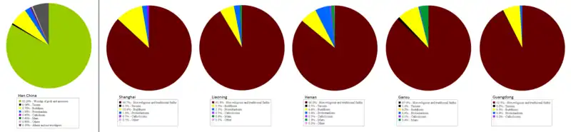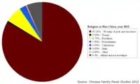 - Religion traditionnelle chinoise : sous ce terme sont regroupés dans certaines statistiques les taoïstes et pratiquants de la religion populaire : 932 millions ou 69,5 %[1]