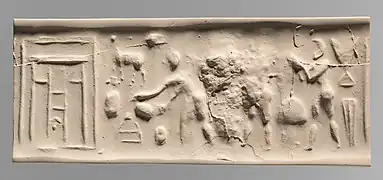 Les dieux avaient des attributs les symbolisant dans l'art et pouvant manifester leur présence : des animaux (le taureau pour le dieu de l'orage, le lion pour Ishtar)[58], emblèmes (la bêche pour Marduk qui avait un aspect agraire à l'origine, le croissant de lune pour Sîn), et ils pouvaient être associés à des planètes, étoiles ou constellations du ciel nocturne.