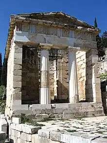 Les sources archéologiques[56] et artistiques comprennent des nécropoles, des temples, des autels, des statues, vases et autres objets d'art, du matériel à usage rituel. L'archéologie permet notamment de restituer le contexte physique des cultes grecs antiques, tandis que l'étude des images à partir des œuvres d'art offre un aperçu de la mythologie et aussi de certains rituels[57],[58]. Dès le début du XXe siècle, les chantiers de fouilles des principaux sanctuaires grecs sont ouverts, et le sont encore : Délos et Delphes par des équipes françaises, Olympie et Samos par des équipes allemandes, Corinthe et Argos par des Américains, les Grecs participant aussi à plusieurs chantiers majeurs, notamment l'Acropole d'Athènes[59]. L'intégration des sources archéologiques dans les études sur la religion grecque a longtemps été en retrait, face à la prééminence des textes, mais les travaux les ont mobilisées de plus en plus[55]. L'archéologie permet notamment d'approcher les évolutions des espaces sacrés au moment de la constitution des cités[60].
