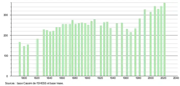 L'évolution du nombre d'habitants est connue à travers les recensements de la population effectués dans la commune depuis 1793. Pour les communes de moins de 10 000 habitants, une enquête de recensement portant sur toute la population est réalisée tous les cinq ans, les populations légales des années intermédiaires étant quant à elles estimées par interpolation ou extrapolation[34]. Pour la commune, le premier recensement exhaustif entrant dans le cadre du nouveau dispositif a été réalisé en 2006[35].
