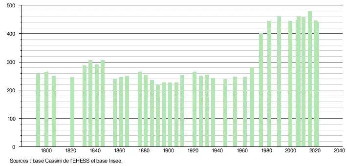 L'évolution du nombre d'habitants est connue à travers les recensements de la population effectués dans la commune depuis 1793. Pour les communes de moins de 10 000 habitants, une enquête de recensement portant sur toute la population est réalisée tous les cinq ans, les populations légales des années intermédiaires étant quant à elles estimées par interpolation ou extrapolation[22]. Pour la commune, le premier recensement exhaustif entrant dans le cadre du nouveau dispositif a été réalisé en 2005[23].