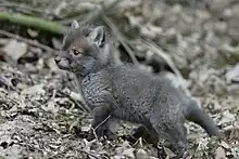 Pendant les trois premières semaines, l'alimentation des renardeaux est quasi exclusivement constituée du lait maternel[90]. À partir de l'âge de 18 jours apparaissent les premières dents, les canines, qui seront suivies des incisives puis des prémolaires[93]. Les renardeaux commencent alors à manger de la nourriture solide, d'abord régurgitée par la mère, puis à partir de l'âge de trois semaines constituée des morceaux de viande qu'elle leur apporte[93]. Leur croissance est très rapide pendant leurs premières semaines de vie, et ils atteignent 800 g à 1 kg à 20 jours[93]. Vers 25 jours, de nombreuses bagarres éclatent entre les renardeaux, qui établissent une hiérarchie entre eux[93]. Ils effectuent leurs premières sorties hors du terrier au bout de quatre semaines[85]. Il peut arriver à ce stade que la femelle déplace la portée vers un autre terrier si elle ne se sent pas en sécurité[94]. Elle transporte alors les petits dans sa gueule en les attrapant par la nuque[94]. Ils sont sevrés entre six et neuf semaines[85]. Dès lors, ils se nourrissent exclusivement des proies ramenées par leurs parents, et la mère les repousse s'ils tentent de téter[95]. Les jeunes quémandent la nourriture en s'approchant de l'adulte à plat ventre tout en poussant de petits jappements, puis en lui mordillant les babines[95].