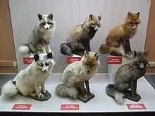 Son pelage est généralement roux, mais comporte des variations suivant les sous-espèces. Il peut varier du jaune-beige au marron foncé. Les parties latérales du museau, la gorge, le dessous du ventre, la face interne des membres et l'extrémité de la queue sont blancs ou du moins plus clairs que le reste de l'animal[20],[23]. L'extrémité des pattes est généralement noire[23]. Les oreilles ont des poils plus clairs à l'intérieur, et sont brun foncé à noir à l'extérieur[24]. Les pattes sont noires[20]. On observe aussi des colorations beaucoup plus sombres, comme chez les renards charbonniers d'Amérique du Nord qui sont de couleur sombre avec un dessous noir, ou certains renards argentés avec une fourrure noire parsemée de longs poils blancs[20]. Il existe également des formes de coloration intermédiaires, appelés renards croisés, qui comportent un motif foncé en croix sur le dos et les épaules[24]. Les cas d'albinisme sont rares chez le renard mais existent néanmoins, souvent ce sont plutôt des individus leucistisques. Dans ce cas l'animal a le bout des oreilles et la queue noirs[24]. On trouve de tels spécimens dans les zones forestières du sud, et ils présentent souvent diverses malformations. Ils sont plus fréquents les années où la nourriture est rare[25].