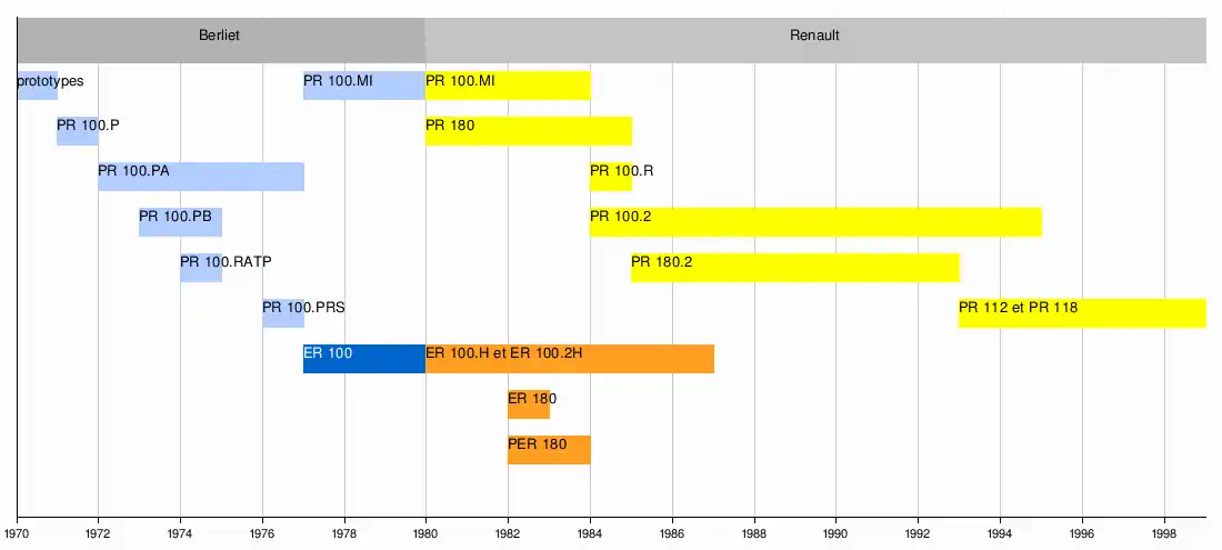 Le PR 100 est le premier autobus français à moteur arrière à être produit en grande série. Les modèles des deux principaux constructeurs doivent leurs noms à leurs capacités, 100 places pour les versions standard puis à leurs longueurs, 12 m pour les versions standard et 18 m pour les versions articulées. D'autres équipementiers ou carrossiers, en France (au premier rang desquels Heuliez) ou à l'étranger, utilisent la base du PR 100 pour construire leurs propres véhicules. Ce sont 11 760 exemplaires de l'autobus, toutes variantes confondues, qui sont produits par Berliet puis Renault — le SAVIEM SC 10 est produit à 11 004 exemplaires — mais aussi par des partenaires ou sous licence, en France et à l'étranger, qui portent le total à 20 600 exemplaires.