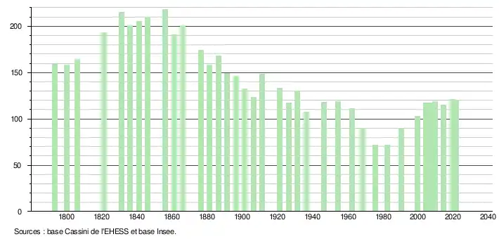 L'évolution du nombre d'habitants est connue à travers les recensements de la population effectués dans la commune depuis 1793. Pour les communes de moins de 10 000 habitants, une enquête de recensement portant sur toute la population est réalisée tous les cinq ans, les populations légales des années intermédiaires étant quant à elles estimées par interpolation ou extrapolation[16]. Pour la commune, le premier recensement exhaustif entrant dans le cadre du nouveau dispositif a été réalisé en 2004[17].