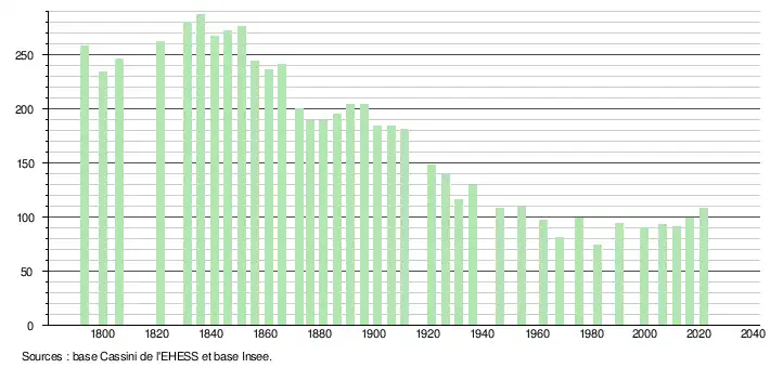 L'évolution du nombre d'habitants est connue à travers les recensements de la population effectués dans la commune depuis 1793. Pour les communes de moins de 10 000 habitants, une enquête de recensement portant sur toute la population est réalisée tous les cinq ans, les populations légales des années intermédiaires étant quant à elles estimées par interpolation ou extrapolation[17]. Pour la commune, le premier recensement exhaustif entrant dans le cadre du nouveau dispositif a été réalisé en 2006[18].
