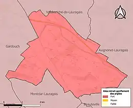 Le retrait-gonflement des sols argileux est susceptible d'engendrer des dommages importants aux bâtiments en cas d’alternance de périodes de sécheresse et de pluie. La totalité de la commune est en aléa moyen ou fort (88,8 % au niveau départemental et 48,5 % au niveau national). Sur les 219 bâtiments dénombrés sur la commune en 2019, 219 sont en aléa moyen ou fort, soit 100 %, à comparer aux 98 % au niveau départemental et 54 % au niveau national. Une cartographie de l'exposition du territoire national au retrait gonflement des sols argileux est disponible sur le site du BRGM[28],[Carte 3].