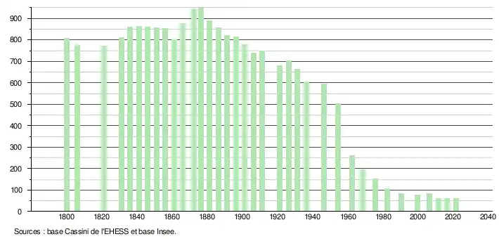L'évolution du nombre d'habitants est connue à travers les recensements de la population effectués dans la commune depuis 1800. Pour les communes de moins de 10 000 habitants, une enquête de recensement portant sur toute la population est réalisée tous les cinq ans, les populations légales des années intermédiaires étant quant à elles estimées par interpolation ou extrapolation[9]. Pour la commune, le premier recensement exhaustif entrant dans le cadre du nouveau dispositif a été réalisé en 2006[10].