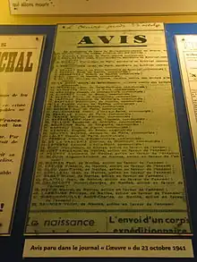 - Journal La Croix du 23 octobre 1941, page 1, colonnes 1 et 2 :