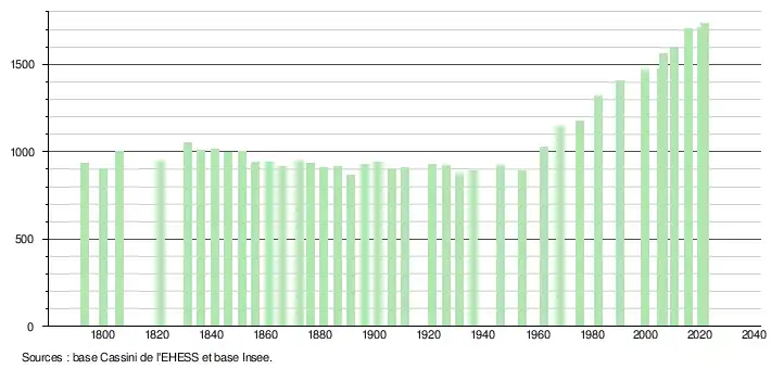 L'évolution du nombre d'habitants est connue à travers les recensements de la population effectués dans la commune depuis 1793. Pour les communes de moins de 10 000 habitants, une enquête de recensement portant sur toute la population est réalisée tous les cinq ans, les populations légales des années intermédiaires étant quant à elles estimées par interpolation ou extrapolation[27]. Pour la commune, le premier recensement exhaustif entrant dans le cadre du nouveau dispositif a été réalisé en 2005[28].