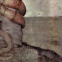 Détail de l’Expulsion de l'Éden avant restauration : obscurcissement, fissuration, dépôts métalliques dus aux interventions anciennes, taches d'humidité, dépôts de sel et de salpêtre, et divers repeints. |