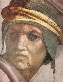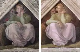 La perte de profondeur n'est pas le seul facteur vivement déploré. Un aspect important de l'œuvre de Michel-Ange, qui a disparu à jamais dans de nombreuses occurrences, est la peinture des pupilles des yeux de ses personnages[23]. Cependant, tout le monde ne s'accorde pas à dire qu'il s'agit d'ajouts à sec de Michel-Ange : il pourrait aussi s'agir d'ajouts de restaurateurs ultérieurs désireux d'amplifier la lisibilité des fresques[23].