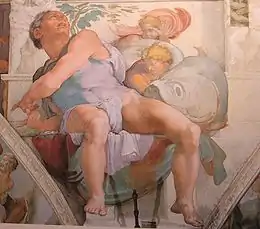 La grande figure de Jonas est très importante pour l'ensemble de la composition, tant d'un point de vue pictural que théologique, car c'est un symbole du Christ ressuscité. La figure, qui occupe le panache qui s'élève au-dessus de l'autel pour soutenir les voûtes, est étirée vers l'arrière, les yeux tournés vers Dieu. La représentation en raccourci décrite par Vasari était novatrice et a eu une grande influence sur les peintres ultérieurs. Le nettoyage de cette figure fondamentale a laissé peu de restes d'ombres noires visibles à l'extrême gauche du tableau. Toutes les autres lignes et voiles noirs moins intenses ont été effacés, diminuant l'impact, et supprimant également de nombreux détails du grand poisson et des figures architecturales.