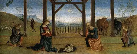 Encore plus originales est la prédelle avec L'Annonciation et L'Adoration de l'Enfant, où le Pérugin a utilisé un « coup de pinceau » rapide et effiloché, typique des œuvres de petites dimensions du début du XVIe siècle.