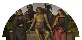 La cimaise représente une Pietà : Christ mort et assis sur le sépulcre soutenu par Joseph d'Arimathie et Nicodème avec sur les côtés les pleureurs, Marie et Jean. Bien que la scène soit dramatique, les expressions des personnages sont caractérisés par une calme et douce contemplation. Seule la figure du Christ porte clairement les signes de sa Passion.