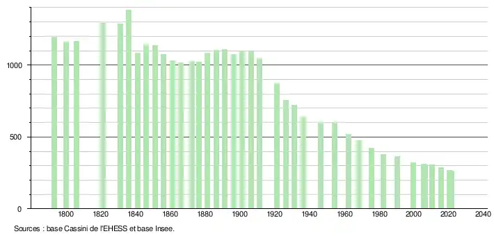 L'évolution du nombre d'habitants est connue à travers les recensements de la population effectués dans la commune depuis 1793. Pour les communes de moins de 10 000 habitants, une enquête de recensement portant sur toute la population est réalisée tous les cinq ans, les populations légales des années intermédiaires étant quant à elles estimées par interpolation ou extrapolation[19]. Pour la commune, le premier recensement exhaustif entrant dans le cadre du nouveau dispositif a été réalisé en 2005[20].