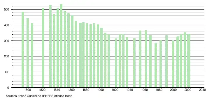 L'évolution du nombre d'habitants est connue à travers les recensements de la population effectués dans la commune depuis 1793. Pour les communes de moins de 10 000 habitants, une enquête de recensement portant sur toute la population est réalisée tous les cinq ans, les populations légales des années intermédiaires étant quant à elles estimées par interpolation ou extrapolation[33]. Pour la commune, le premier recensement exhaustif entrant dans le cadre du nouveau dispositif a été réalisé en 2005[34].