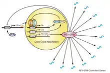 Dans le cycle circadien, la protéine REV-ERBα est en compétition avec la protéine RORα pour lier le promoteur des protéines BMAL1 et NPAS2 (NPAS2 est similaire à la protéine CLOCK). RORα active la transcription de BMAL1 et NPAS2. REV-ERBα vient inhiber l'action de RORα, et cela a pour conséquence d'inhiber la transcription des protéines BMAL1 et NPAS2[2],[3].