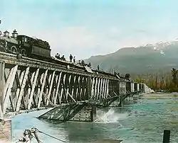 ![]() Pont en bois à Revelstoke, C.-B., vers 1886 |