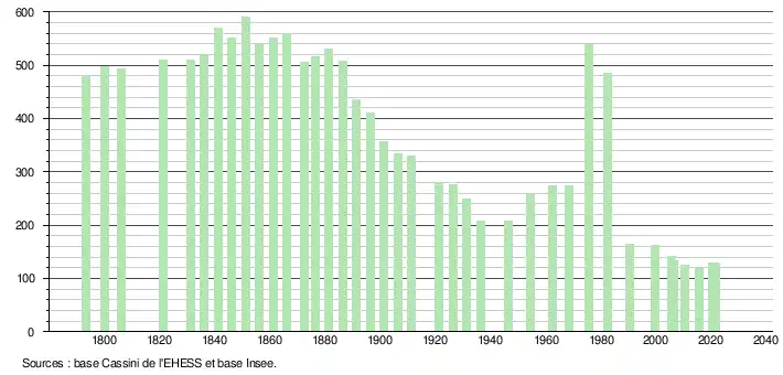 L'évolution du nombre d'habitants est connue à travers les recensements de la population effectués dans la commune depuis 1793. Pour les communes de moins de 10 000 habitants, une enquête de recensement portant sur toute la population est réalisée tous les cinq ans, les populations légales des années intermédiaires étant quant à elles estimées par interpolation ou extrapolation[15]. Pour la commune, le premier recensement exhaustif entrant dans le cadre du nouveau dispositif a été réalisé en 2005[16].