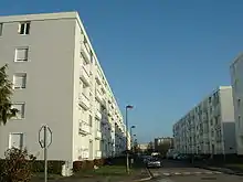 Vue partielle de Rezé avec, de gauche à droite, l'hôtel de ville, l'église Saint-Pierre et la Cité Radieuse. | |||||
