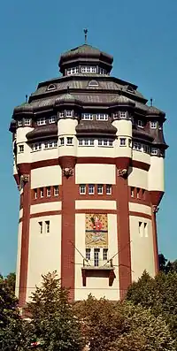 - Le château d'eau (de) (Wasserturm) sur la rue Viersener Straße, Mönchengladbach-Stadtmitte, construit en 1908-09, dessiné par Otto Greiß