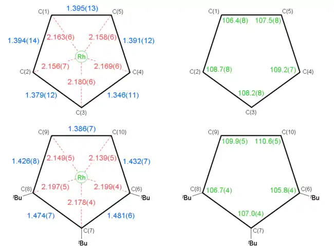 Le diagramme ci-dessus montre les longueurs de liaison rhodium–carbone (en rouge, à l'intérieur des pentagones de gauche) et carbone–carbone (en bleu, à l'extérieur des pentagones, à gauche) pour les deux ligands, ainsi que les angles de liaison (en vert, dans les pentagones de droite) à l'intérieur de chaque cycle de cyclopentadiényle. La numérotation des atomes utilisée est la même que pour la structure cristalline. Pour le ligand cyclopentadiényle non-substitué, les longueurs de liaison carbone–carbone varient de 1,35 Å à 1,40 Å, et les angles internes varient de 107° à 109°. Par comparaison, dans un pentagone régulier, ces angles sont de 108°. Les longueurs de liaison rhodium–carbone varient elles de 2,16 Å à 2,18 Å[42]. Ces résultats sont cohérents avec la coordination η5 du ligand vers le centre métallique. Dans les cas du ligand cyclopentadiényle substitué, les variations sont plus grandes : les longueurs de liaison carbone–carbone varient de 1,39 Å à 1,48 Å, les angles internes de 106° à 111°, et les longueurs de liaison rhodium–carbone varient elles de 2,14 Å à 2,20 Å. Ces plus grandes variations dans les ligands substitués est attribuée aux distorsions nécessaires pour soulager le tension stérique imposée par les substituants tert-butyle voisins ; en dépit de ces variations, ces données montrent que le cyclopentadiényle substitué est aussi un ligand η5-coordonné[42].