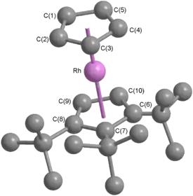 Le diagramme ci-dessus montre les longueurs de liaison rhodium–carbone (en rouge, à l'intérieur des pentagones de gauche) et carbone–carbone (en bleu, à l'extérieur des pentagones, à gauche) pour les deux ligands, ainsi que les angles de liaison (en vert, dans les pentagones de droite) à l'intérieur de chaque cycle de cyclopentadiényle. La numérotation des atomes utilisée est la même que pour la structure cristalline. Pour le ligand cyclopentadiényle non-substitué, les longueurs de liaison carbone–carbone varient de 1,35 Å à 1,40 Å, et les angles internes varient de 107° à 109°. Par comparaison, dans un pentagone régulier, ces angles sont de 108°. Les longueurs de liaison rhodium–carbone varient elles de 2,16 Å à 2,18 Å[42]. Ces résultats sont cohérents avec la coordination η5 du ligand vers le centre métallique. Dans les cas du ligand cyclopentadiényle substitué, les variations sont plus grandes : les longueurs de liaison carbone–carbone varient de 1,39 Å à 1,48 Å, les angles internes de 106° à 111°, et les longueurs de liaison rhodium–carbone varient elles de 2,14 Å à 2,20 Å. Ces plus grandes variations dans les ligands substitués est attribuée aux distorsions nécessaires pour soulager le tension stérique imposée par les substituants tert-butyle voisins ; en dépit de ces variations, ces données montrent que le cyclopentadiényle substitué est aussi un ligand η5-coordonné[42].