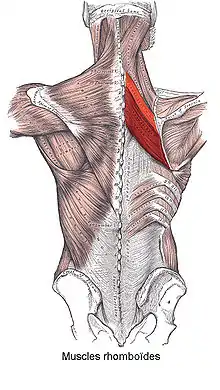 Ce sont des muscles thoraciques dorsaux, pairs, plats et de forme losangique. Ils se situent entre le rachis et la scapula. Les rhomboïdes font partie des muscles dorsaux superficiels (comme le trapèze et l'élévateur de la scapula), cependant, ils sont situés en profondeur, en dessous du trapèze[1]. Les rhomboïdes s'insèrent sur les vertèbres allant de C7 à T5 et permettent de créer un mouvement de translation ou de rotation médiale de la scapula si le rachis est le point fixe.