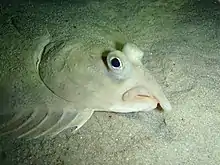 Le poisson naît avec des yeux de chaque côté. Durant sa croissance, son corps devient ovale, ses yeux se rangent du côté droit et un « nez » d'excès de peau se forme. À l'âge adulte, il vit dans les eaux peu profondes et capture ses proies grâce à son camouflage.