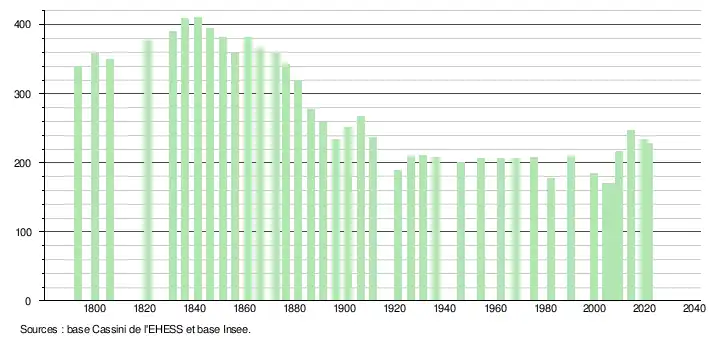 L'évolution du nombre d'habitants est connue à travers les recensements de la population effectués dans la commune depuis 1793. Pour les communes de moins de 10 000 habitants, une enquête de recensement portant sur toute la population est réalisée tous les cinq ans, les populations légales des années intermédiaires étant quant à elles estimées par interpolation ou extrapolation[19]. Pour la commune, le premier recensement exhaustif entrant dans le cadre du nouveau dispositif a été réalisé en 2004[20].