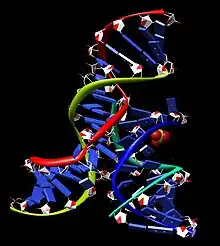 Structure tertiaire du ribozyme en épingle à cheveux montrant son repliement naturel. La séquence du ribozyme est représentée en gris et la séquence du substrat en rose. Le site de clivage et de jonction est représenté en bordeaux ; il est situé entre les nucléotides A-1 et G+1. Les séquences importantes des boucles A et B sont représentées, les points noirs indiquant les appariements non conventionnels (non Watson-Crick) entre nucléotides. Les deux nucléotides catalytiques sont représentés en vert, et le nucléotide critique C25, apparié au résidu G+1 au niveau du site actif, est représenté en bleu[12].