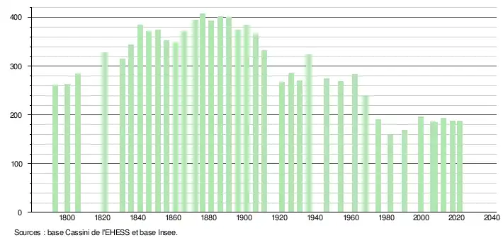 L'évolution du nombre d'habitants est connue à travers les recensements de la population effectués dans la commune depuis 1793. Pour les communes de moins de 10 000 habitants, une enquête de recensement portant sur toute la population est réalisée tous les cinq ans, les populations légales des années intermédiaires étant quant à elles estimées par interpolation ou extrapolation[27]. Pour la commune, le premier recensement exhaustif entrant dans le cadre du nouveau dispositif a été réalisé en 2007[28].